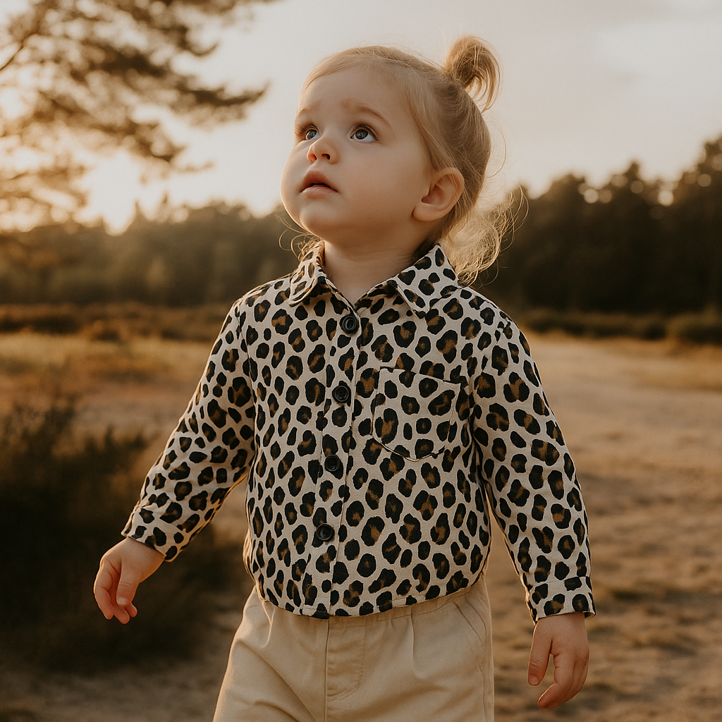 Een vleugje wild, een hoop zachtheid. Het Savann Shirt brengt de magie van de savanne tot leven met een leopard design, speciaal voor nieuwsgierige kleintjes die graag op pad gaan.